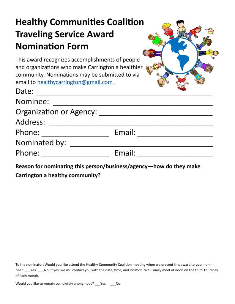 In recognition of people and organizations who demonstrate commitment to building a healthy community, the Carrington Area Healthy Communities Coalition gives a quarterly Service Award.